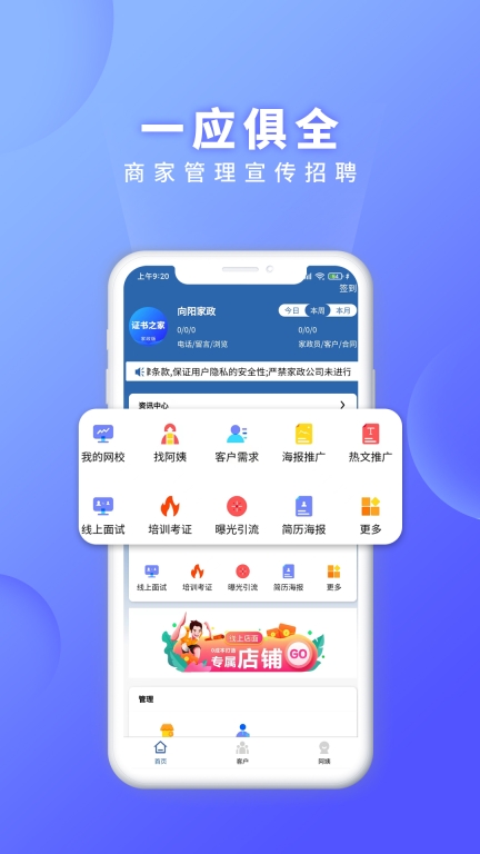 证书之家家政版APP,这是专为家政行业量身打造的管理软件。软件具备多样化的操作功能,用户能直接在线使用。它功能丰富,可助力商家更高效地管理客户信息,有需要的商家可直接下载使用!