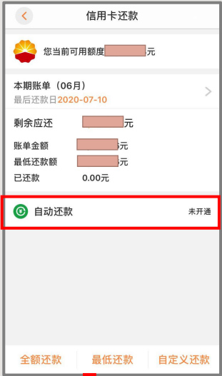 1. 用户进入应用内的信用卡还款界面时,中间系统会出现提示:“自动还款 - 未开通”