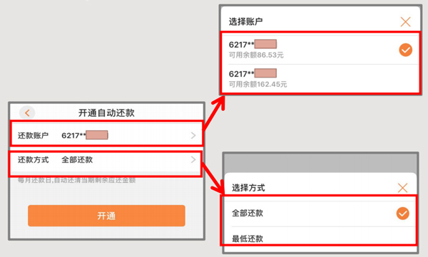 2、点击“未开通”进入开通自动还款界面,还款账户可点选,系统显示本人名下所有储蓄卡号,另外还款方式可以点选:全部还款、最低还款