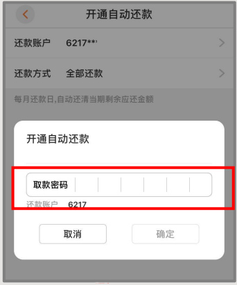 3、输入“取款密码”点击“确定”则开通成功。此处交易密码为还款账户的取款密码