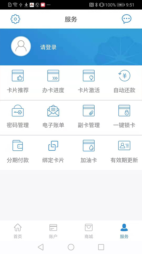 4、“服务”提供卡片推荐、办卡进度查询、卡片激活、自动还款设置、密码管理、电子账单、附卡管理、一键锁卡等功能