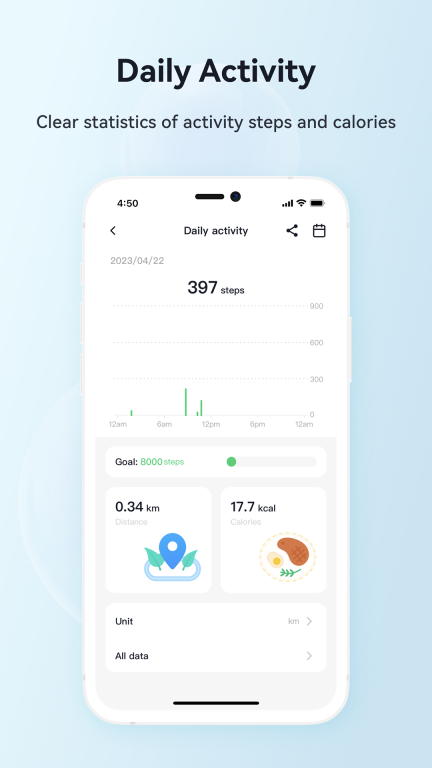计步及卡路里消耗功能:能自动记录用户每日的步数、行走距离,以及所消耗的卡路里,助力用户实现运动目标。