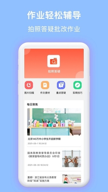 作业辅导与答疑、拍照搜题便捷获取答案、名师在线精细讲解、作文素材快速搜索、行业热门动态聚焦、知识要点干货分享,还有助力家长辅导作业的实用小工具。