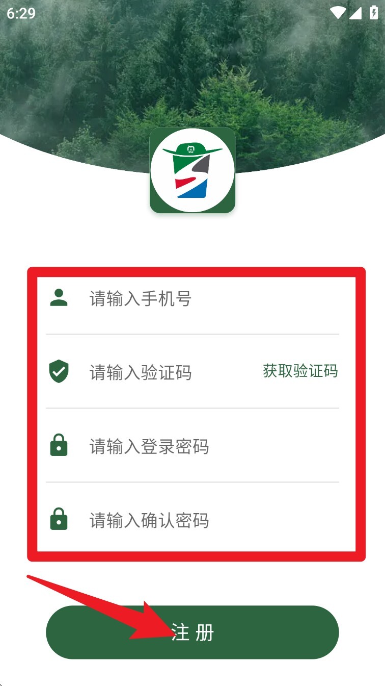1. 打开App,点击注册按钮,按顺序填写手机号、验证码以及两次密码,填完后点击“注册”。