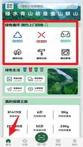3. 完成登录操作后,系统会默认跳转到首页。在首页的“绿色循环预约上门回收”区域,用户能够选择所需的回收类型。