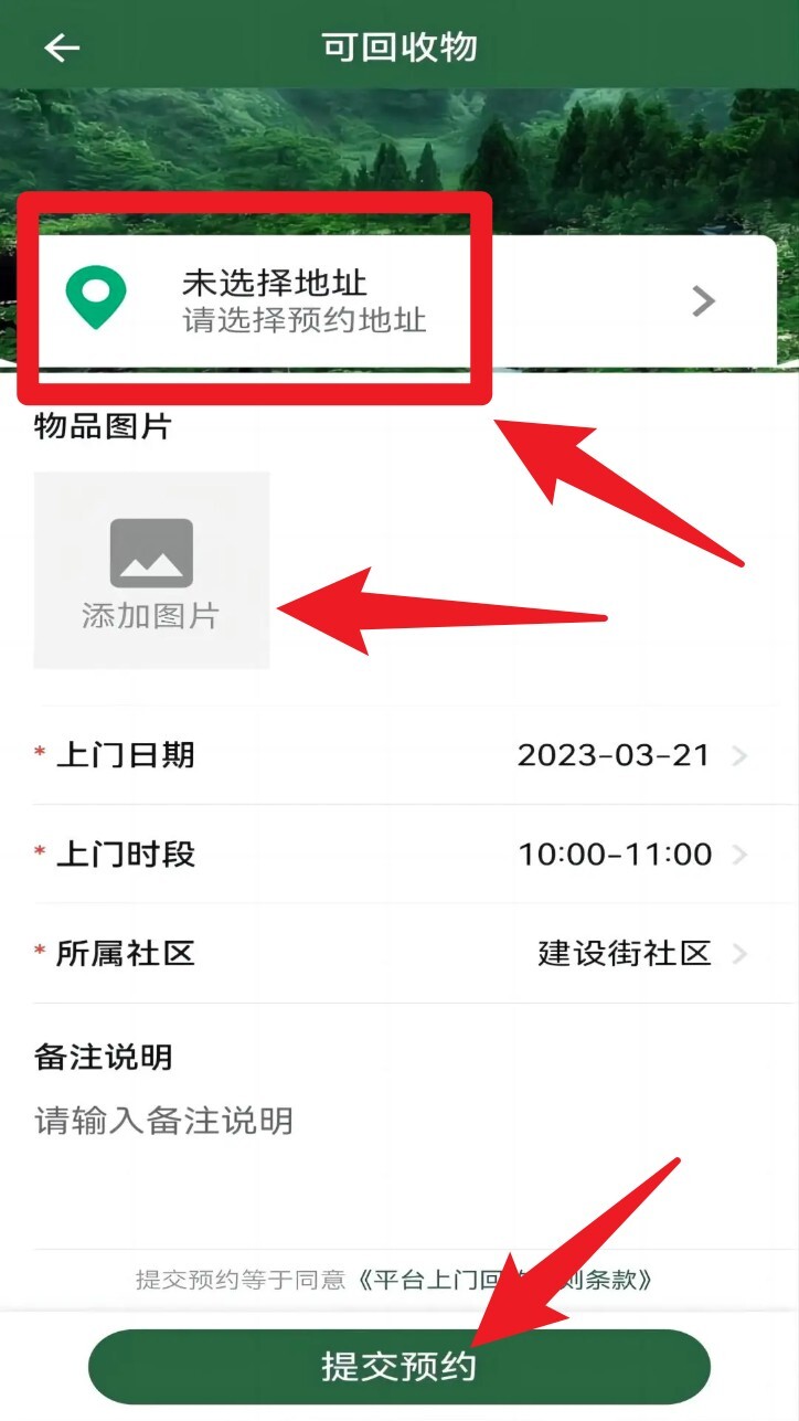 4. 在预约页面,依次选择上门地址、上传物品图片、填写时间及备注,完成后点击“提交预约”。