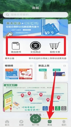 5. 轻点底部的“商城”按钮,即可进入积分商城,在这里能够兑换图书、周边产品或者话费卡等各类商品。