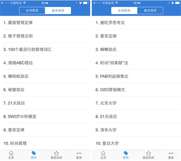 除主页外,MBA智库百科还设有推荐阅读页。推荐阅读页共分为两个部分——本周推荐与最多推荐,页面中按热门程度分别为用户列出10个本周或近期比较热门的名词供用户了解。