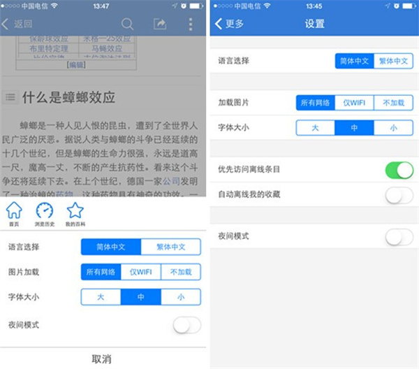 MBA智库百科还为用户提供了诸如简繁体中文的切换、不同网络接入时图片是否加载、阅读字体的大小以及夜间模式等实用的小功能,让用户可以更好的根据个人阅读习惯进行选择。