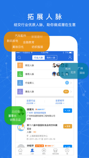 结识服装、纺织、汽配、美妆日化、农产品、食品等行业的优质人脉,助力你达成潜在生意。