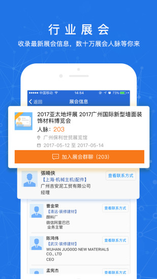 汇聚全行业展会信息,数十万展会人脉清单待你拓展。一键即可结识行业内最为活跃且专业的人士。