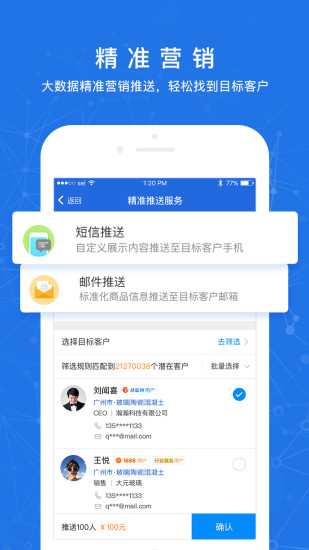 定向精准推送曝光,让对的人来与你谈生意。依托百万人脉、大数据筛选以及人工定制搜索,让每一笔推广费用都发挥出超值效益。