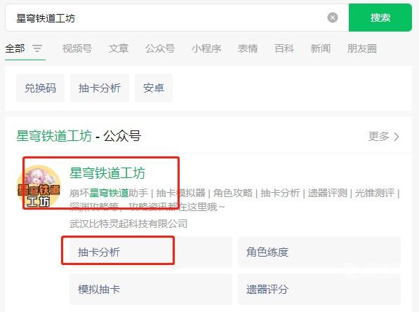 6. 点开微信,在搜索栏查找“星穹铁道工坊”。进入该公众号后,挑选抽卡分析小程序。