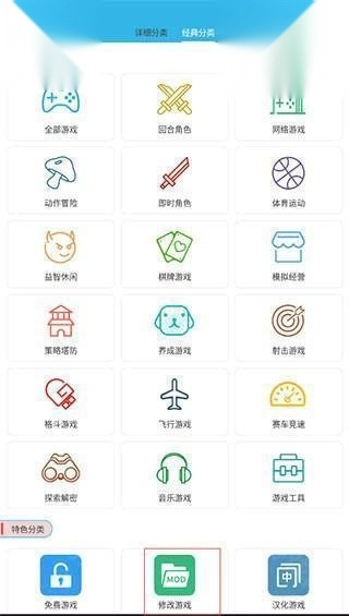 3、向下滑动页面,找到特色分类,即可发现修改过的游戏,点击对应修改游戏的按键进入。