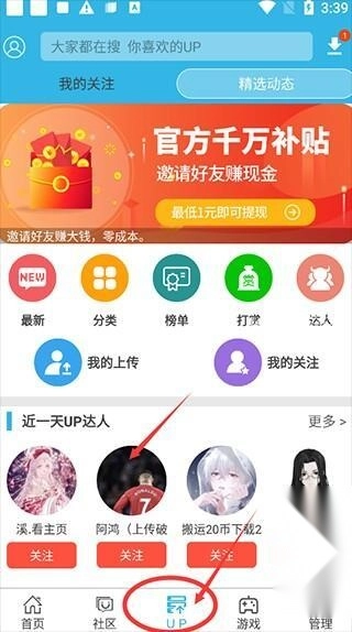 1. 打开后,在进入的主页面中选择“up”功能按钮,接着点击进入,找到达人排行,挑选图中所示的达人。