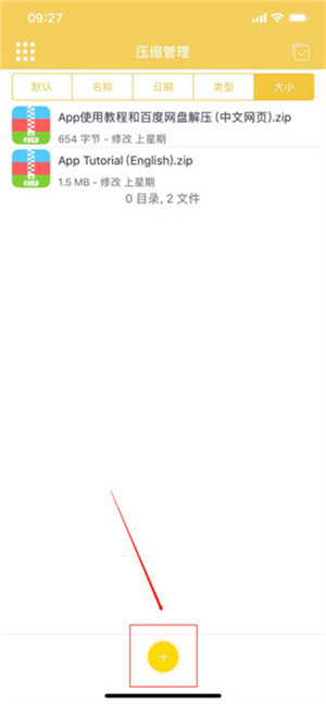 2、完成后,在手机桌面找到并进入“解压专家”界面。点击软件界面底部的黄色“+”号,如下图所示。