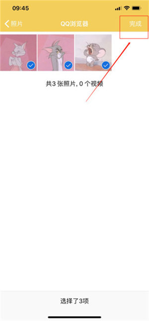 4、打开手机相册页面,把需要打包的照片都勾选上,然后点击“完成”,具体操作如以下图片所示。
