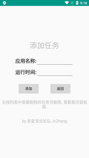 2、在添加任务时,需输入应用名称,并设置运行时间。例如,早上8点应写成08:00,下午5点则写成17:00 。
