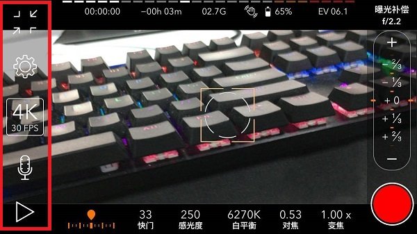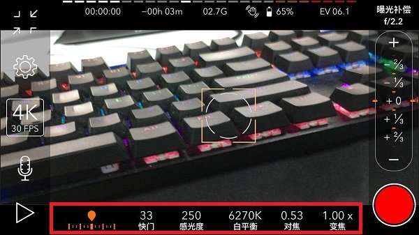 4、在下方的一栏里,能够对快门、感光、白平衡、对焦、变焦等参数进行更改。