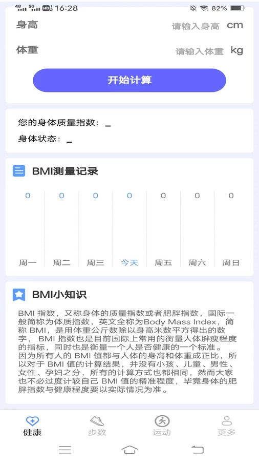 4、BMI计算器:输入个人的身高、体重来计算BMI值,帮助用户更科学地管理自己的健康。