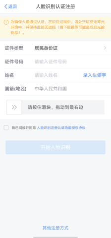 2. 选取人脸识别认证注册方式,确认同意相关协议,并如实填报身份信息。依照提示开展人脸识别拍摄,比对成功后,你需设置登录凭据。