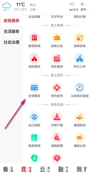 1. 于软件的主界面当中,寻找到掌上医疗,接着点击社保查询。