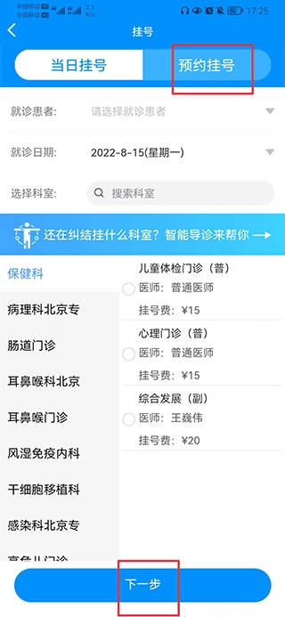 二、在预约挂号中选择科室,以及医师后,点击下一步