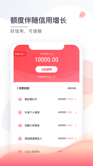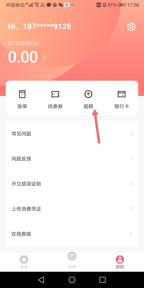 若需要提升额度,您可以进入【我的】页面,点击【提额】按钮来完成相关操作。