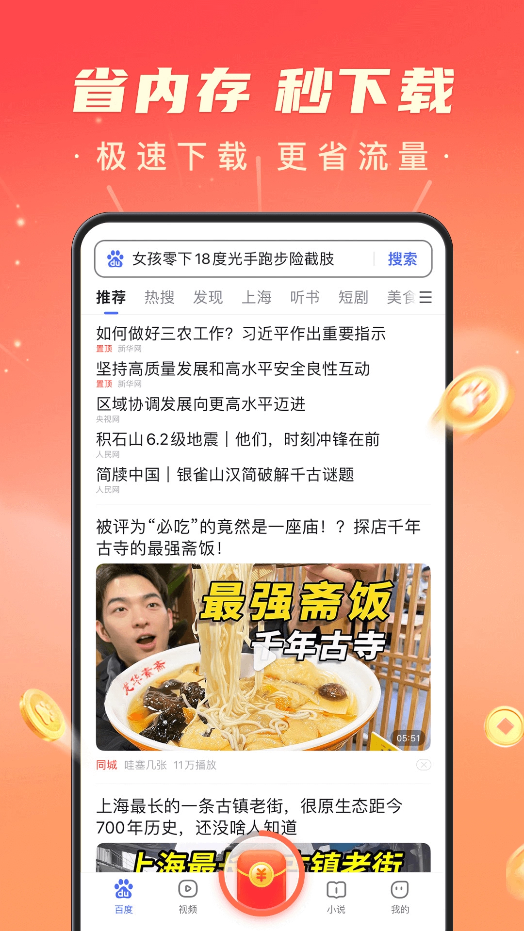 百度极速版是一款简洁流畅的手机浏览器工具,为用户提供舒适的浏览体验,操作轻快便捷,搜索结果一键直达,同时占用内存更小,即使是小容量手机也能流畅运行!