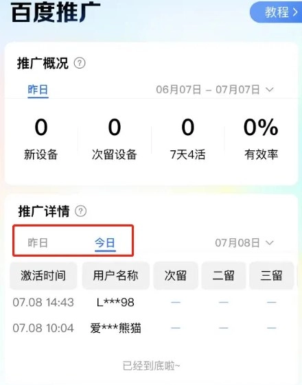 在「百度推广」页面可查看当日社保推广的具体情况,还能了解该用户从次日到第8日的留存数据。页面默认优先展示昨日的推广数据,若想查看今日数据,则需要点击「今日」按钮。