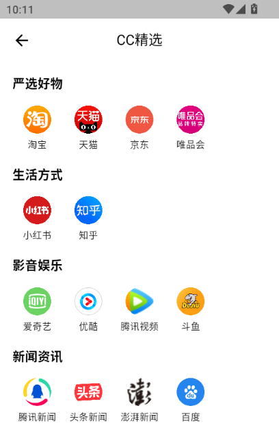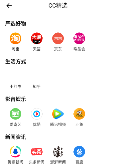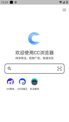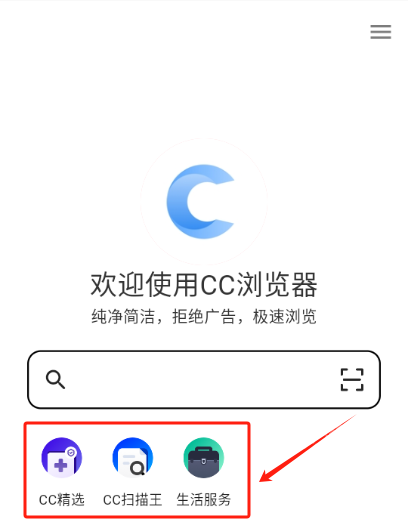 打开CC浏览器后,映入眼帘的主页上设有“cc精选”“cc扫描王”以及“生活服务”这几个板块。