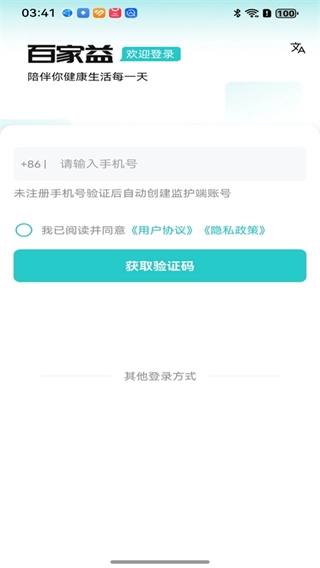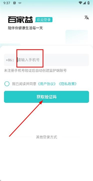 在手机登录页面输入手机号,勾选相关协议后,点击“获取验证码”按钮。