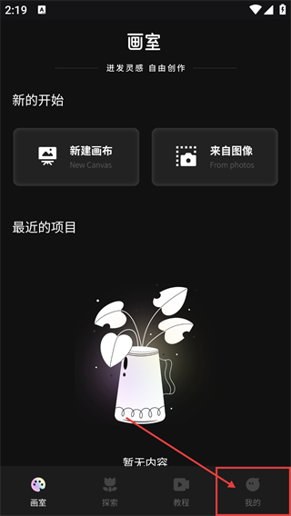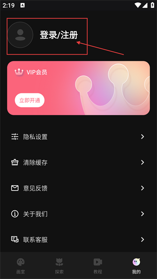 1、在【画室】主界面,点击底部导航栏中的【我的】选项,即可进入个人中心页面,在此页面可以看到登录/注册、会员开通等功能的入口。