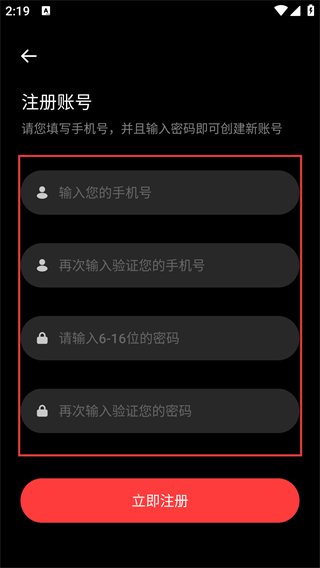 4、进入注册页面后,需按顺序填写【手机号】并完成二次验证,接着设置6-16位的密码并进行二次验证,所有步骤完成后点击【立即注册】按钮,即可成功创建账号。