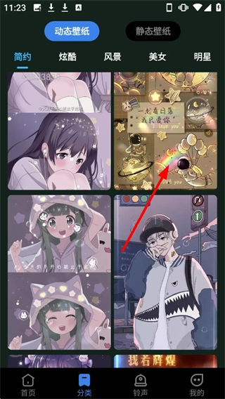 2、在分类页面挑选自己喜爱的动态壁纸,比如【炫酷】【风景】这类分类下的壁纸。