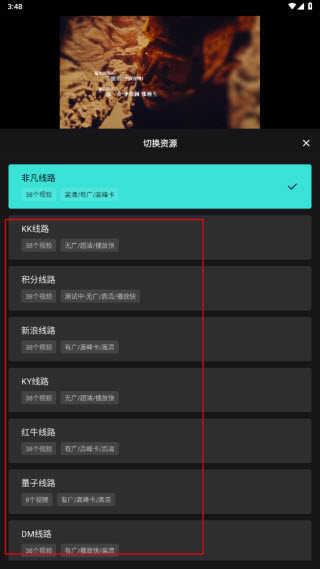 3. 可选择的线路有KK线路、积分线路、新浪线路等(不限于这些)。要是碰到无法正常播放的状况,建议尝试切换线路来解决问题。