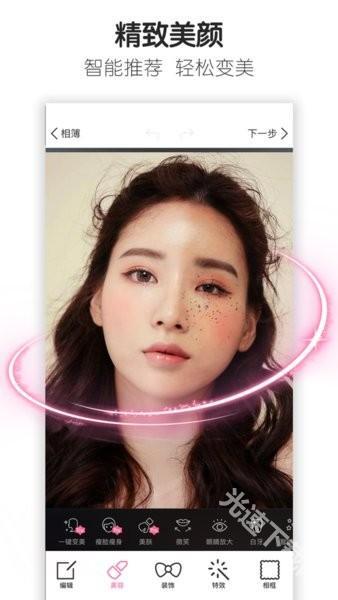 2、“美颜”功能——只需指尖轻触或涂抹操作,就能轻松实现美白、祛痘、放大眼睛、瘦脸等效果,是专门为热衷于自拍和肖像美化的用户量身定制的。