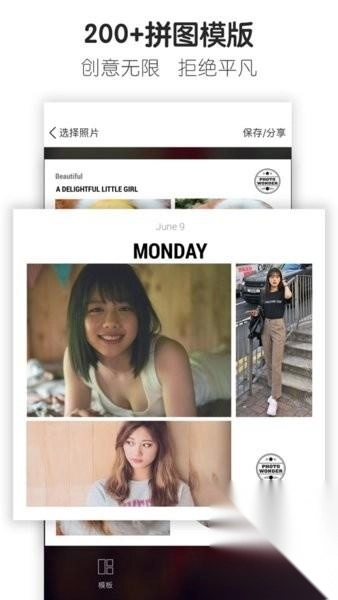 模板拼图,免费拼图和图片拼接3种拼图模式,丰富的模板,清新的背景,帮你打造个性化的图片墙。