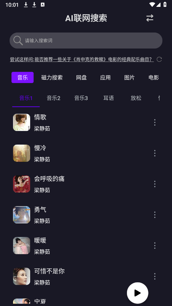 AI资源搜索,一款为用户量身打造的资源查找利器,覆盖音乐、影视、漫画等各类资源,分类细致清晰,支持资源下载,随时随地都能使用,全程免费,满足大家的多样化需求,有需要的话赶紧来体验吧。