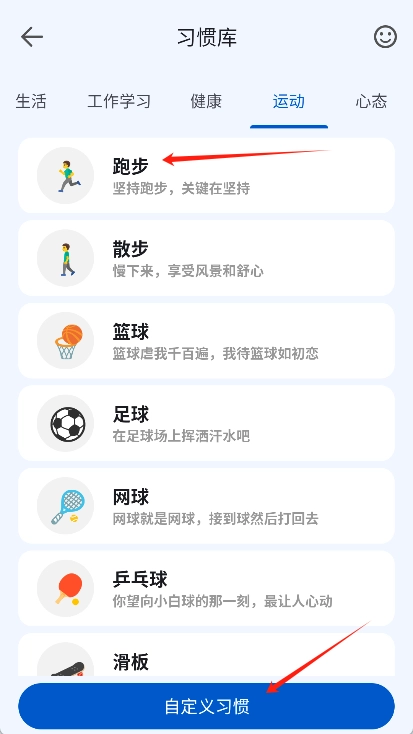 3、从软件自带的习惯库中挑选任意一个打卡目标,像跑步打卡这类都可以。