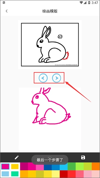 3、按照页面上方画板的教程开展创作,借助下方画板进行练习,点击按钮来切换步骤。