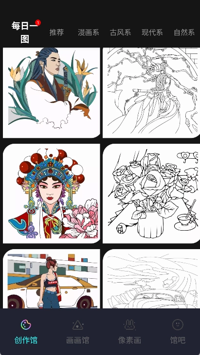 1、打开并进入【创作馆】页面后,可在该页面选择配色库、临摹区、涂色区或色彩测试功能。