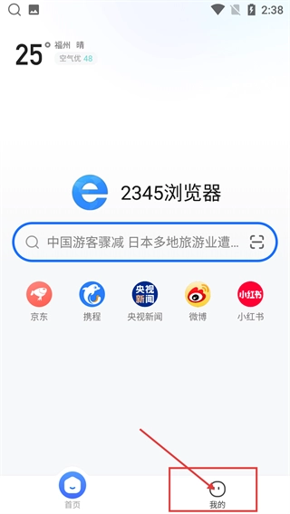 1、在【2345浏览器】首页,点击底部导航栏中的【我的】选项,即可展开个人功能菜单,之后可开展登录等相关操作。