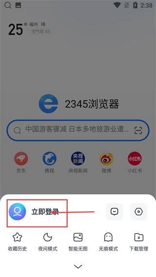 2、打开个人功能菜单后,点击【立即登录】选项,就能进入该浏览器的登录页面,为账号登录操作做准备。