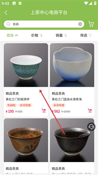 在搜索页面挑选热门标签(例如【茶具】),就能进入该品类对应的商品列表页面。