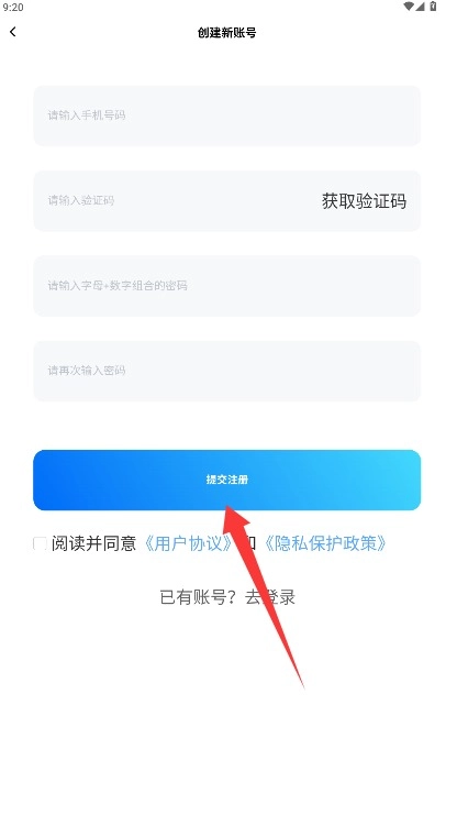 1、填写手机号码与短信验证码,设置好密码,勾选同意相关协议后,点击提交完成注册操作。