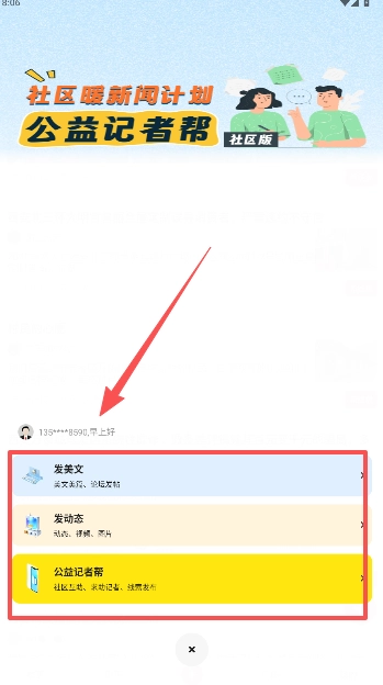 5、中间的红色加号,是软件内的另一项功能,主要通过论坛形式呈现,用户可以在这里发布美文、日常记录、动态,或是参与公益记者活动等。