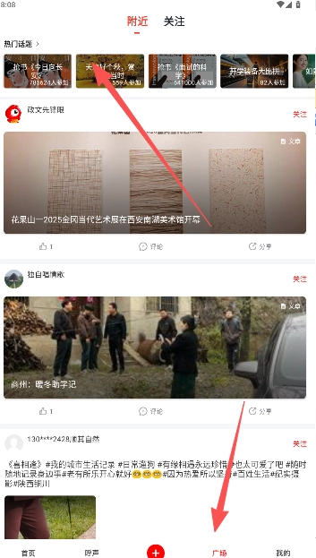 6、广场板块,主要依据用户所处的位置进行内容推送,涵盖附近发生的新鲜事、各类活动,以及近期热度较高的话题类内容。