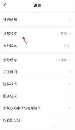 3、在设置页面中,找到并点击“推送设置”选项,进入推荐设置管理页面。