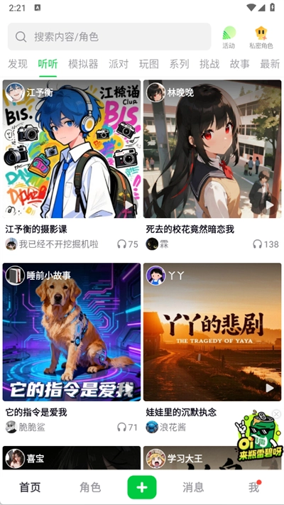 在造梦次元这款软件里,还有不少有意思的功能,比如你能在这里听到各种各样有趣的故事,参与各类趣味挑战小游戏之类的。